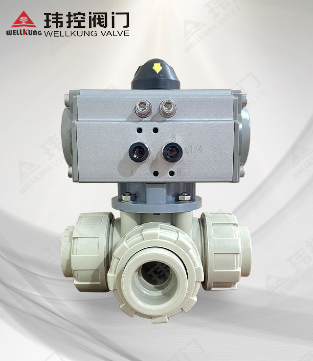 玮控气动双由任球阀,双活接设计、安装快速、检修方便。三通道回转型球阀,用于介质的分流、合流及流向切换