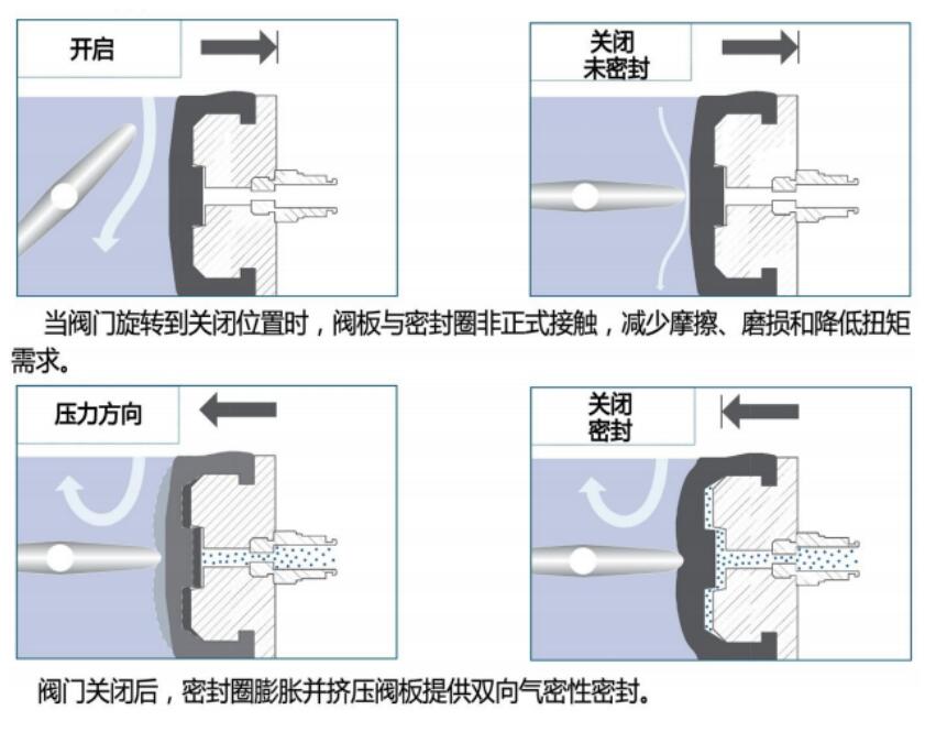 1. 膨胀式密封系统:阀座的**设计使阀体和阀座有一个连续、可变形空腔。当阀板关闭后,阀座在外部气源的压力下,慢慢膨胀并抱紧阀板以达到密封的效果。需要开启时,空腔内的压力会快速排空让阀座收缩以释放阀板再打开,启闭过程中阀座和阀板的接触时间和面积非常少。